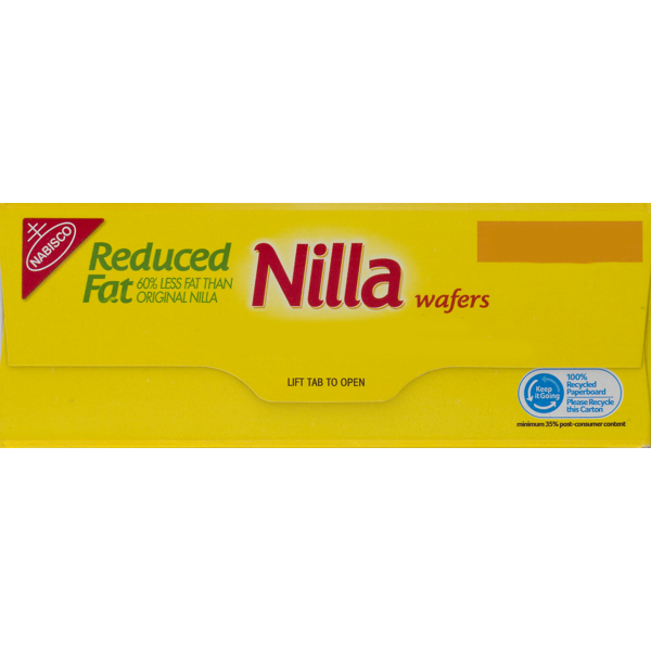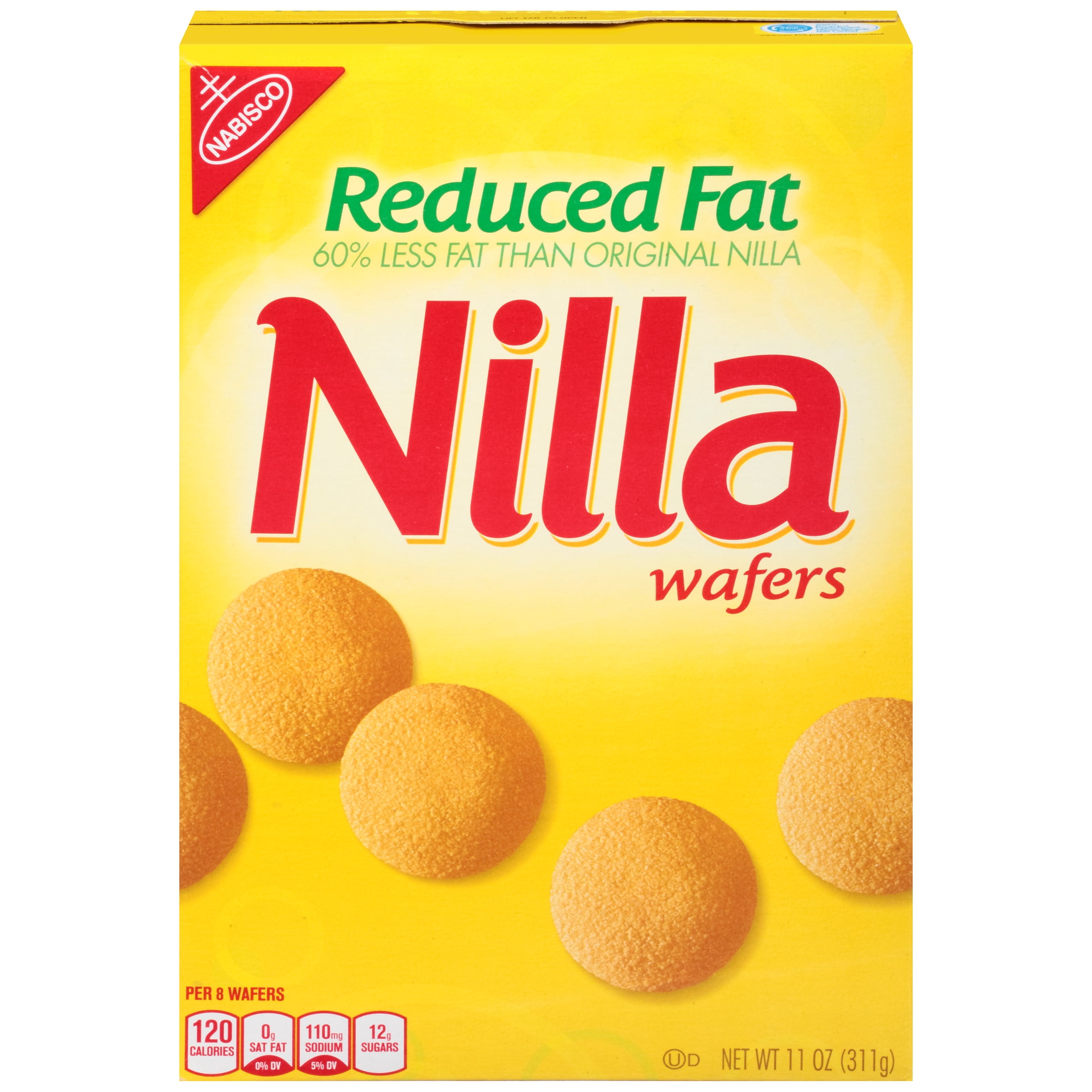 Nabisco Nilla Wafers 11.0 oz - SmartLabel™ Nabisco Nilla Wafers 11.0 oz 140 Calories 1.5 Sat Fat (g) 115 Sodium (mg) 11 Tot Sugars (g) Nutrition Facts About 10 Servings Per container Serving Size 8 wafers (30g) Amount Per Serving Calories 140 % Daily Value * Total Fat 6 g 9.0% Saturated Fat 1.5 g 8.0% Trans Fat 0 g Cholesterol 5 mg 0.0% Sodium 115 mg 5.0% Total Carbohydrate 21 g 7.0% Calories in Nabisco Nilla Wafers Reduced Fat and Nutrition Facts 1.5g. Carbs. 24g. Protein. 1g. There are 120 calories in 8 wafers (29 g) of Nabisco Nilla Wafers Reduced Fat. Calorie breakdown: 12% fat, 85% carbs, 4% protein. Nabisco Nilla Wafers Vanilla Reduced Fat - Giant Per 8 Wafers: 120 calories; 0 g sat fat (0% DV); 110 mg sodium (5% DV); 12 g sugars. Reduced fat nilla wafers have 2 grams of fat per serving compared with 6 grams in original nilla wafers. Reduced fat. 60% less fat than original Nilla. No cholesterol. Nabisco. This package is sold by weight, not by volume.