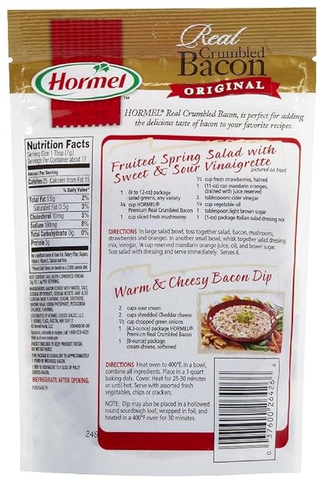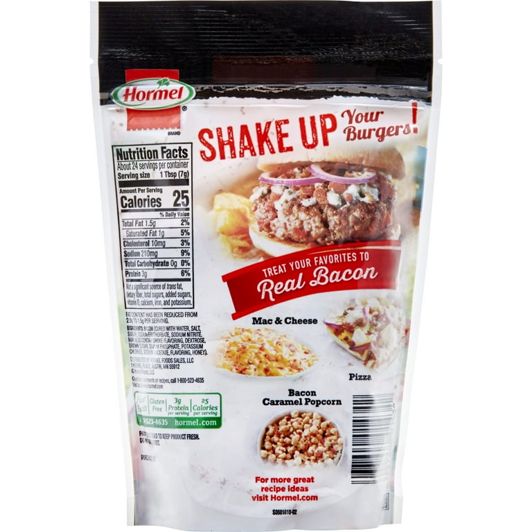 Home - HORMEL® Bacon Canada Hormel ® Real Bacon Toppings. Real Bacon. Real Fast. Real Easy. Bacon-Centric Summer Soiree - Inspired - Hormel Foods In medium saucepan over medium-high heat combine chicken stock and tomatoes. Bring to boil. Reduce to simmer. In large skillet over medium heat, cook bacon 7 to 9 minutes, or until crispy. Remove with slotted spoon to paper towel lined plate. Reserve. In same skillet over medium-high heat, add onion and salt. Add oil if necessary. Hormel | Products | HORMEL® Real Bacon Hormel Bacon Toppings: Enhance your meals, snacks and salads with the delicious flavor of 100% real bacon. ... Smoke Flavoring Added USA Domestic Ingredients: Bacon (Cured With, Water, Salt, Sugar, Sodium Erythorbate, Sodium Nitrite., May also contain Smoke Flavoring, Dextrose, Brown Sugar, Sodium Phosphate, Sea Salt, Potassium Chloride, Sodium ...