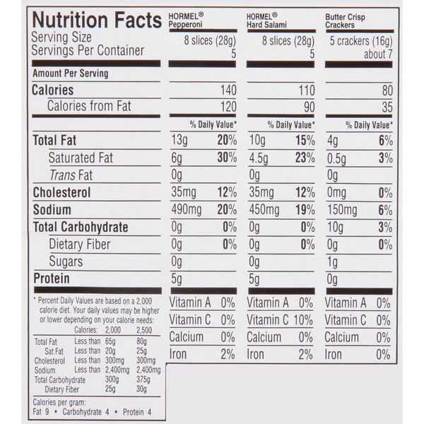 PDF Sliced Turkey Pepperoni, Child Nutrition Label, 16 Slices Per Ounce Serving Size 30 g Amount Per Serving Calories 80 Calories From Fat 35 Total Fat 4 g Saturated Fat 1.5 g Trans Fat 0 g Cholesterol 40 mg Sodium 550 mg Potassium 140 mg Total Carbohydrates 0 g Dietary Fiber 0 g Sugars 0 g Protein 9 g Vitamin A 2% Vitamin C 0% Iron 4% Calcium 0% * Percent daily values are based on a 2,000 calorie diet. Hormel Pepperoni Nutrition Label - hormel turkey pepperoni nutrition ... [Hormel Pepperoni Nutrition Label] - 13 images - 34 hormel pepperoni nutrition label label ideas 2020, pick n save hormel turkey pepperoni minis 4 oz, buy hormel pepperoni original 3 5 ounces online mercato, hormel natural choice pepperoni 5 oz, HORMEL® Pepperoni - Brands - Hormel Foods For more than 100 years, pepperoni has been a longtime American favorite and a well-known Hormel Foods specialty. Today, Hormel ® pepperoni is the No. 1 selling brand of pepperoni in the United States, thanks to its great flavor and high quality. Everyone knows pepperoni tastes great on pizza, but enterprising cooks also rely on its delicious spicy flavor to add zest to a wide variety of dishes. Hormel Pepperoni Nutrition Facts • MyFoodDiary® Nutrition information for Hormel Pepperoni. Track calories, carbs, fat, and 18 other key nutrients. Start your food diary today! Toggle navigation. Home; Blog; Help; Sign In; Join; ... Hormel Pepperoni Snack Bites. 1 container (35g) Nutrition Facts. 170 calories. Log food: Hormel Hard Salami & Pepperoni Gatherings snack tray. 8 slices.