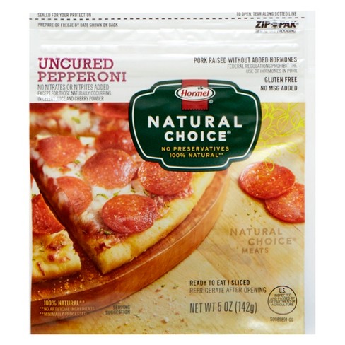 Calories in Hormel Natural Choice Original Uncured Pepperoni and ... Natural Choice Original Uncured Pepperoni. Nutrition Facts. Serving Size. 17 slices (30 g) Amount Per Serving. Calories. 150. % Daily Values*. Total Fat.