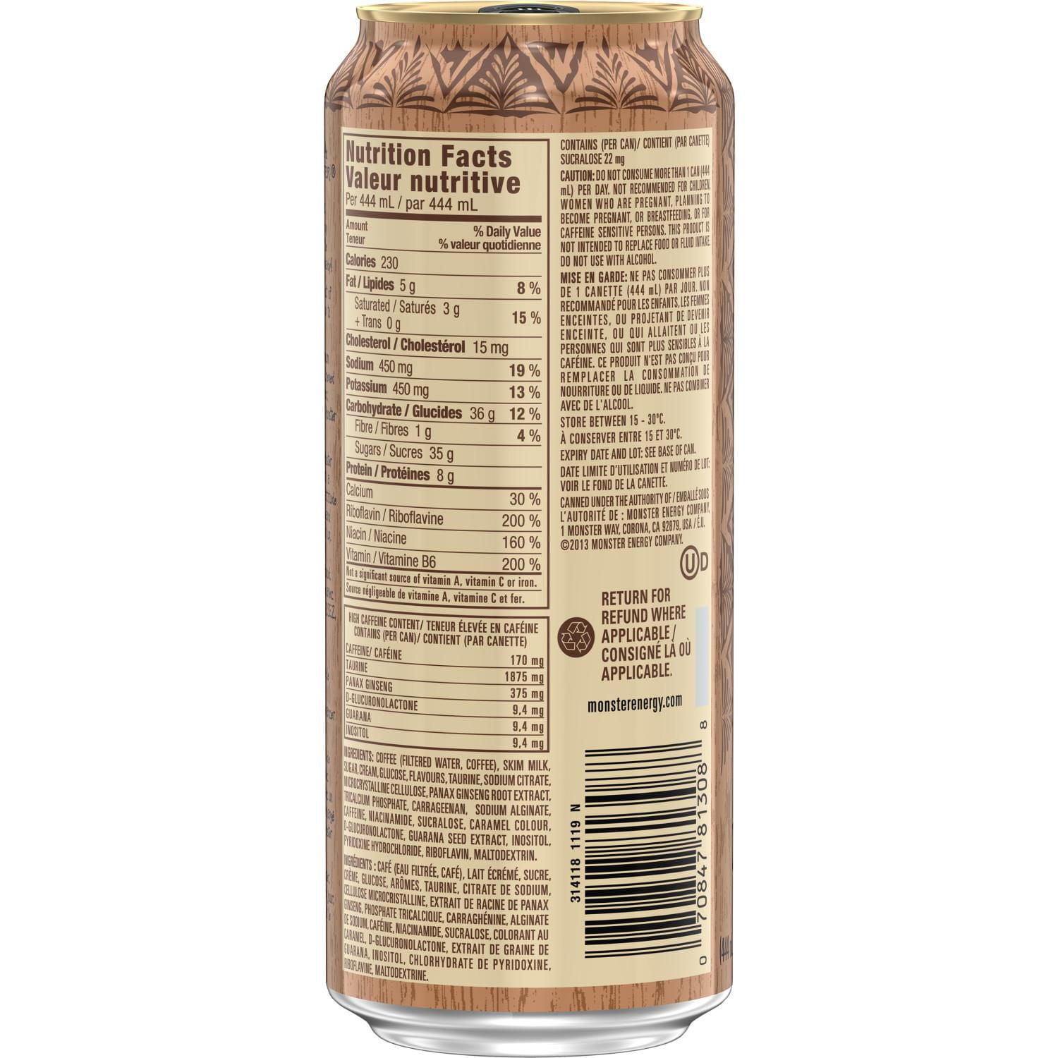 Mean Bean Java Monster 15 Fl.oz (443ml - Coffee Energy Drink calories ... Mean Bean Java Monster 15 Fl.oz (443ml Mean Bean Java Monster 15 Fl.oz (443ml - Coffee Energy Drink Serving Size : 16 oz 220 Cal 67% 36g Carbs 17% 4g Fat 17% 9g Protein Track macros, calories, and more with MyFitnessPal. Join for free! Daily Goals How does this food fit into your daily goals? Calorie Goal 1,780 cal 220 / 2,000 cal left Java Monster 300 Mocha | Triple Shot Coffee Energy Drink Java Monster Triple Shot Mocha . 300mg Natural Caffeine, 3x Shots, Seriously Strong Coffee, Robust Coffee + Cream . Flavor Profile: Rich chocolate with robust brewed coffee. Seriously Strong Coffee. Find Near Me Buy on Amazon Buy on Walmart Total Caffeine: 300 mg. Per Serving: 300 mg Per Can. Java Monster, Coffee + Energy Drink, 3 Flavor Variety Pack 15 Ounce ... Java Monster, Coffee + Energy Drink, 3 Flavor Variety Pack 15 Ounce (Pack of 12) Brand: Monster Energy Beverages. 3.6 out of 5 stars 3 ratings. ... 180 calories per can Premium brewed coffee, cream and supercharged with the Monster Energy blend Kosher Non-Carbonated