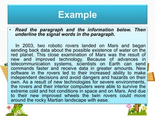 essayfreelancewriters.com › blog › signal-words8 Sensational Signal Words For Essay And How To Use Them Jan 26, 2022 · Signal words are like invisible stitches that connect two halves of a sentence. Signal phrases serve as guides ensuring only certain things will be communicated when using them. Signal words are also known as transitions. Signal words are just a transition between two sentences; they also help the reader understand how one sentence relates to ...