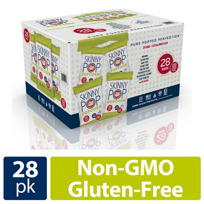 Skinny Pop Popcorn 100 Calorie Bags - 24ct : Target Highlights. A 28ct box of Skinny Pop Popcorn individual serving pouches. 100 Calories per bag, Non GMO, and Gluten Free popcorn snack. Ideal for packed lunches, vending machines, and on-the-go snacking. Pack of 28 grab-and-go snack size bags. SkinnyPop popcorn is 100% natural.