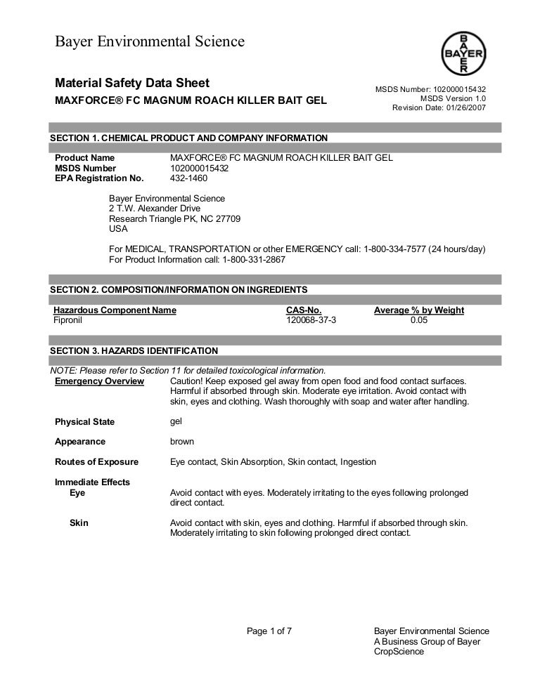 Maxforce FC Select Roach Killer Bait Gel Product | Bayer ES US Maxforce FC Select Roach Killer Bait Gel - Maxforce FC Select Roach Killer Bait Gel has been proven to attract and kill both normal and bait-averse German cockroaches in problem sites around the country. ... ALWAYS READ AND FOLLOW LABEL INSTRUCTIONS. Bayer Environmental Science, a Division of Bayer CropScience LP, 5000 CentreGreen Way, Suite ... PDF Maxforce FC Select MSDS - ePestControl.com Bayer Environmental Science A Business Group of Bayer CropScience SECTION 1. CHEMICAL PRODUCT AND COMPANY INFORMATION Product Name MAXFORCE® FC SELECT PROFESSIONAL INSECT CONTROL® ROACH KILLER BAIT GEL MSDS Number 102000005017 EPA Registration No. 432-1259 Bayer Environmental Science 2 T.W. Alexander Drive Research Triangle PK, NC 27709 USA