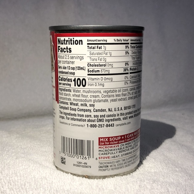 Campbell's cream of mushroom soup nutrition label. Campbell's Soup: 10 Campbell's Chunky Soup Flavors & Ranking 3. Sirloin Burger With Country Vegetables. Allison Johnson. The taste is very similar to sirloin steak, but it has tiny chunks of beef patties. If you love hamburger steak, you'll love this soup flavor. 2. Campbell's Chunky Classic Chicken Noodle Soup. Allison Johnson. Naturally, Classic Chicken Noodle is one of my favorites. How To Make Condensed Cream Of Mushroom Soup? Ingredients: WATER, MUSHROOMS, VEGETABLE OIL (CORN, CANOLA AND/OR SOYBEAN), CREAM, MODIFIED CORNSTARCH, WHEAT FLOUR, SALT, MODIFIED MILK INGREDIENTS, SOY PROTEIN ISOLATE, MONOSODIUM GLUTAMATE, TOMATO PASTE, FLAVOR, YEAST EXTRACT, AND DEHYDR The Nutritional Information is derived from the most recent data we have. Can You Eat Mushrooms on a Keto Diet? - Healthline For instance, 1/2-cup (120-mL) serving of Campbell's Cream of Mushroom prepared soup contains 8 grams of carbs, ... like cream of mushroom soup, be sure to read the nutrition label, ... How Long Is Canned Soup Good For After Expiration Date? Products that have a high level of acid, such as canned fruits and vegetables, particularly tomatoes, should be consumed no later than one to two years after their expiration date. Canned foods that are low in acid such as vegetables, meats, and soups should be used within two to three years after their expiration date at the very most.