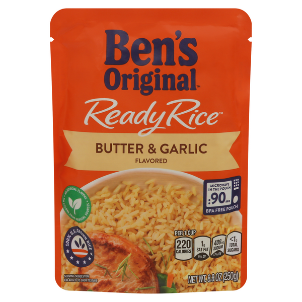Calories in Uncle Ben's Ready Rice, Butter & Garlic Flavored, prepared ... Where do the calories in Uncle Ben's Ready Rice, Butter & Garlic Flavored, prepared as directed come from? 16.7% 75.9% 7.4% Total Fat Total Carbohydrate Protein 220 cal * The % Daily Value (DV) tells you how much a nutrient in a serving of food contributes to a daily diet. 2,000 calories a day is used for general nutrition advice.