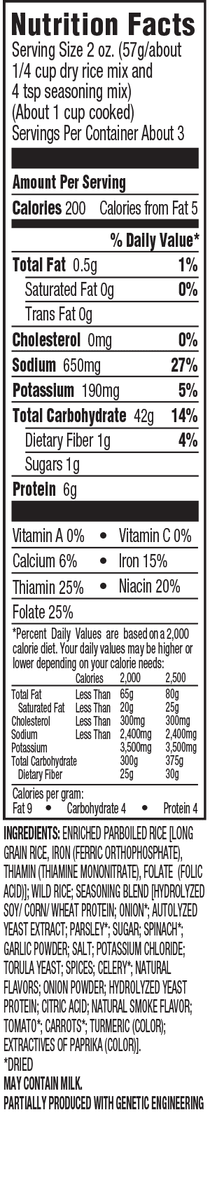 Uncle Ben's Ready Rice, Whole Grain Medley - Fooducate water, parboiled whole grain brown rice, whole grain red rice, less than 2% of: wild rice, canola oil+, natural flavors, hydrolyzed soy, wheat gluten protein, yeast extract, sugar, potassium chloride, sea salt, garlic*, onion*, parsley*, torula yeast, spices, sunflower oil+, spinach, celery stalk and leaf*, guar gum, xanthan gum, gum arabic, corn … Uncle Ben's Rice Converted Long Grain Original 1LB Box Nutrition Facts Sodium free. Excellent source of folic acid.Naturally fat free. Cholesterol free.0g trans fat & no saturated fat.Gluten free & hypoallergenic.Uncle Ben's uses premium rice grains grown in the USA. Other Products In This Category Goya Canilla Rice Extra Long Grain 5LB Bag Goya $5.88 ($0.07 / oz) Uncle Ben's Ready Rice Brown Basmati Rice, 8.5 oz - Walmart.com Buy Uncle Ben's Ready Rice Brown Basmati Rice, 8.5 oz at Walmart.com. ... Nutrition facts. Refer to the product label for full dietary information, which may be available as an alternative product image. ... Uncle Ben's. Manufacturer Part Number. 9134113. Model. 10101099. Assembled Product Dimensions (L x W x H) 1.26 x 5.12 x 7.40 Inches. PDF Product Specifications: Nutrition Facts - Providence Preparatory School Kosher Child Nutrition Serving/Case N 1.0 UNCLE BENS Gross Wt RICE PBH GROCERY DRY Net Wt 25.5 25.0 Class LenXWidthXHt TiHi 22.0X12.25X3.75 ShelfLife Wt Flag 612 450 TempZone DRY N Shipping Information: 375mg Dietary Fiber 25g 2,500 2400mg Sat. Fat Less Than Less Than 30g Sodium 2400mg 25g Protein 4 65g Total Carbohydrate Less Than 300g 20g ...