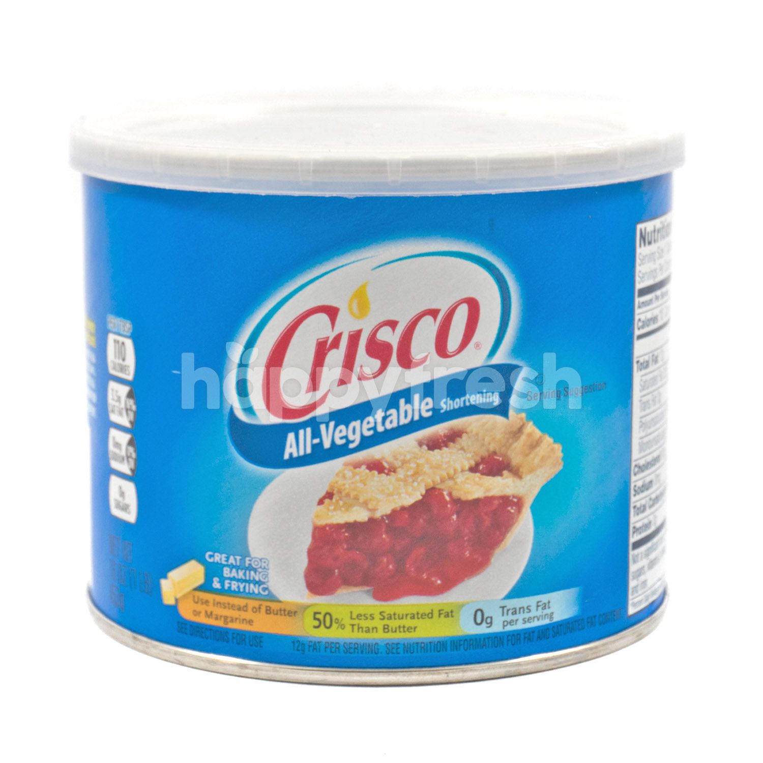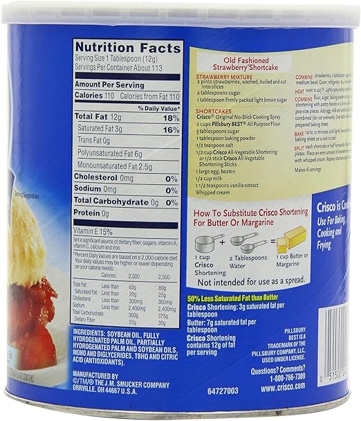 Crisco All-Vegetable Shortening Allergy and Ingredient Information Crisco All-Vegetable Shortening Crisco® all-vegetable shortening. Great for cooking & baking. Use instead of butter or margarine. 50% less saturated fat than butter. 0g trans fat per serving. See directions for use. 12g fat per serving. See nutrition information for fat and saturated fat content., UPC Code 051500239131 Manufactured by J.M. Smucker Co.