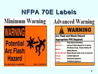 Shop | EG Power EngineeringEG Power Engineering NFPA 70E (2015) Quantity. Price: $ 2.50. Updating cart... Arc Flash Label - Warning. ... Short Circuit Current Rating Label. NFPA 70 (2014) Quantity. Price: $ 2.50. Updating cart... Generic Label - Warning (208VAC) NFPA 70E (2015) Quantity. Price: $ 2.50. PDF 2018 Electrical Safety NFPA 70E - Northwood Tech 2018 NFPA 70E Training Agenda: Define Electrical Safe Work Practices Needs for "Qualified Employees" Discuss Key 2018 NFPA 70E Code Changes Review of PPE Labeling Content and What it Means for Employees -How Are We Using PPE Labels? Review Program One-Line Diagrams and How to Interact with Those for LOTO Planning reak from lass to Perform "Skills ased Training"