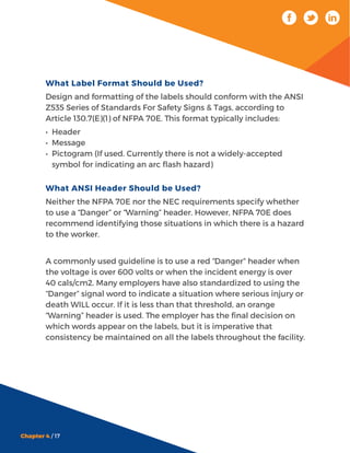 Small labels, big safety message - Plant Services NFPA 70E-2015 Section 130.5 (D) gives facilities choices in ways to communicate the incident energy level and/or required PPE. Whichever labeling option a facility selects, consistency in using it is key. 1. Minimum arc rating of clothing This option potentially allows for development of a simplified arc-flash PPE approach in the facility.