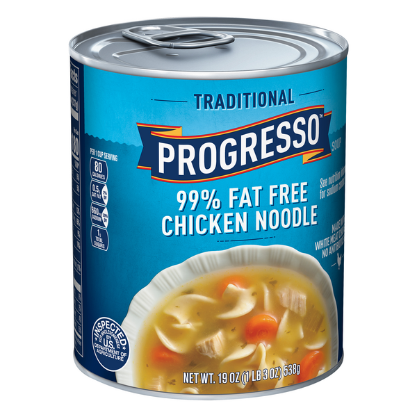 Traditional Chicken Noodle | Canned Soup | Progresso Traditional Chicken Noodle Chicken Noodle is THE classic go-to when you want a hot bowl of comfort food - made with all white meat chicken and lots of flavor. Contains: egg, soy, wheat Low Fat No Artificial Flavors No Colors From Artificial Sources Made with White Meat Chicken with No Antibiotics Ever 110 Cals per Serving Ingredients