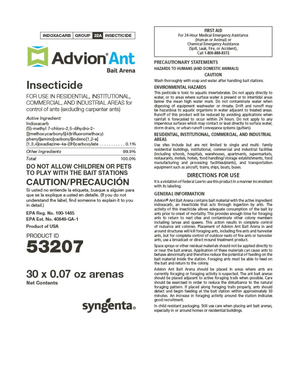 Approved Maintenance Compound (Non-Dairy) - approval codes Oct 13, 2022 · DuPont Advion ant bait arena may be used as an ant pesticide control in conjunction with an approved vermin control programme provided its use does not create a nuisance and is used according to label directions. A copy of this letter must be available to the Inspector of the premises. Type D-13 Advion Ant Bait Arena | Professional Pest Management - Syngenta Advion Ant Bait Arena Insecticide Advion Ant bait arena, featuring the MetaActive™ effect, contains a highly attractive formulation for targeted, thorough control of nuisance ants. The bait is encapsulated in small plastic arenas that can easily be placed where ants are currently or suspected to be foraging. Active Ingredients: Indoxacarb PDF U.S. EPA, Pesticide Product Label, DUPONT ADVION ANT BAIT ARENA, 08/04/2006 DuPont™ Advion® Ant Bait Arena EPA Registration No. 352-664 Your submissions dated February 9, 2006 and May 24,2006 The labeling amendment referred to above, submitted in connection with ... solid waste authority for disposal instructions or 1-888-638-7668. NOTICE TO BL'YER--Purchase ofthi; material does not confer any rights under patents ... Advion Ant Arena - Parsons Pest Management Advion Ant Arena. DuPont™ Advion® ant bait arena provides complete control of nuisance ant colonies with the active ingredient indoxacarb, an insecticide that acts through ingestion by ants. ... so use according to the label instructions and in accordance to any state or federal laws at your own risk. From all of us, thank you for visiting ...