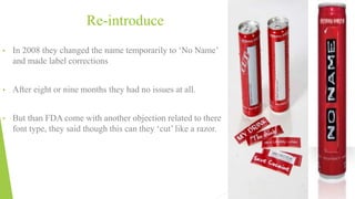 Solved Redux Beverages aroused controversy when it | Chegg.com Question: Redux Beverages aroused controversy when it introduced an energy drink it called Cocaine to the market. The small company had to pull the product from stores when the FEDA objected to its tagline, "the legal alternative." Now, the drink is back - same name but without the tagline and with an anti-drug warning label on the can.