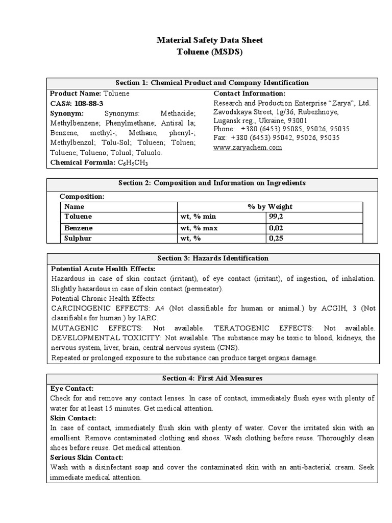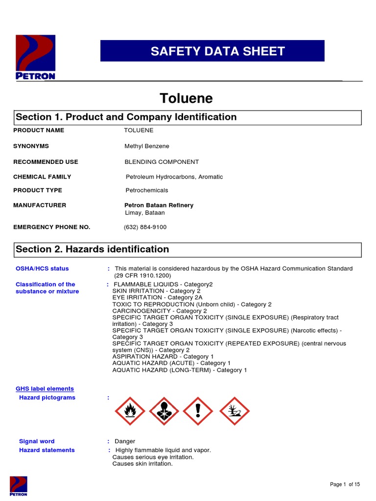 › products › chemicalChemical - Toluene SDS Signs and Labels Toluene Signs and Labels Here you'll find safety signs, labels and pipe markers, as well as NFPA diamonds, GHS labels, PPE and other warnings for Toluene. Material options might include pipe markers, roll labels and stencils in addition to aluminum, plastic, magnetic backing and paper or vinyl labels. Most orders ship within 2 business days. › US › enSAFETY DATA SHEET Revision Date 03/18/2023 Version 6 - ... Product name : Toluene Product Number : 244511 Brand : Sigma-Aldrich Index-No. : 601-021-00-3 CAS-No. : 108-88-3 1.2 Relevant identified uses of the substance or mixture and uses advised against Identified uses : Laboratory chemicals, Synthesis of substances 1.3 Details of the supplier of the safety data sheet