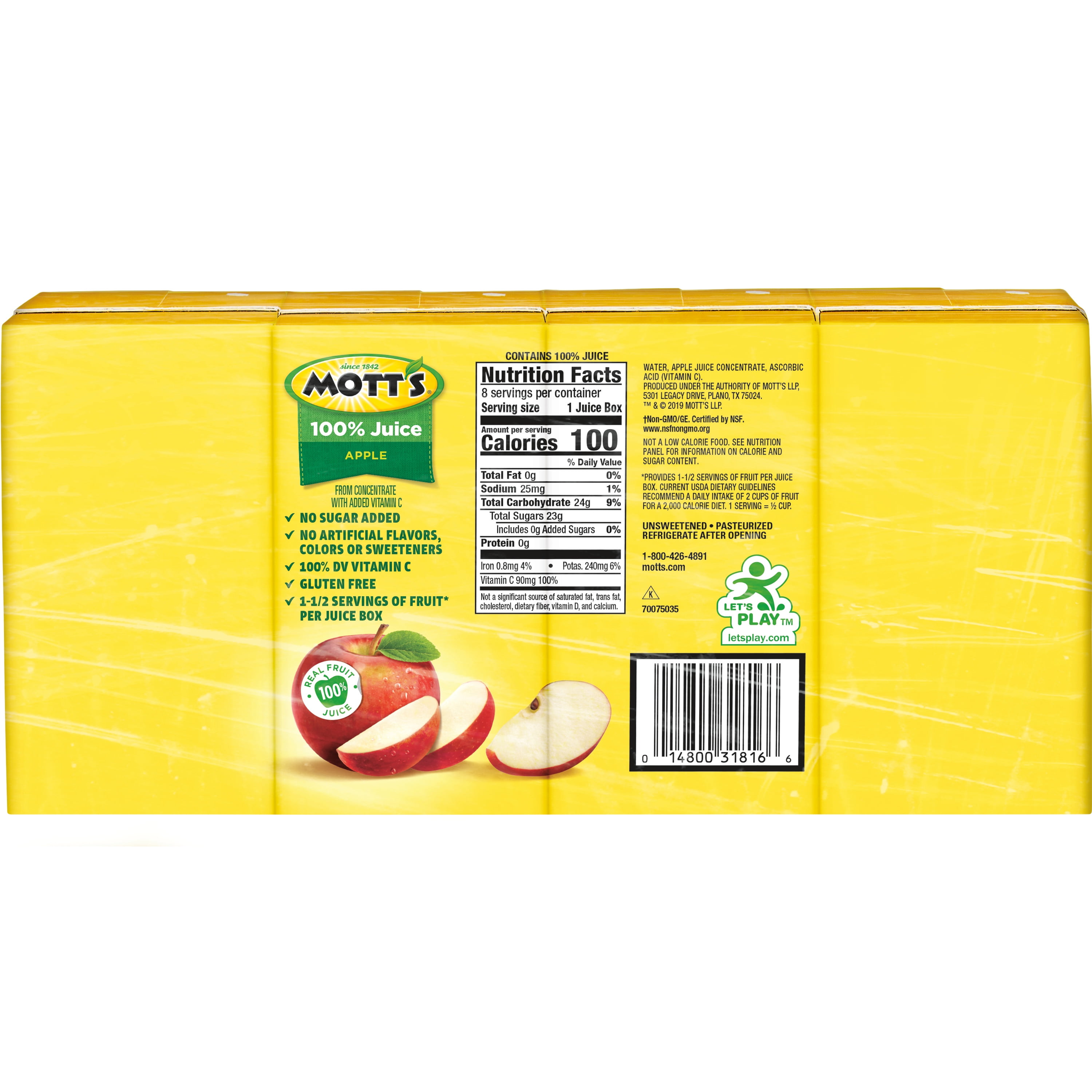 Mott's 100% Apple Juice Original - Giant Food Water, Apple Juice Concentrate, Ascorbic Acid (Vitamin C). Product Disclaimer. Giant Food is committed to providing accurate nutritional information to its ... Calories in 100% Juice, Apple from Mott's - Nutritionix Mar 15, 2023 ... INGREDIENTS: Water, Apple Juice Concentrate, Ascorbic Acid (Vitamin C). Data not available. Cholesterol Free · Low Cholesterol · Low Fat ... Mott's Original 100% Apple Juice - Shop Juice at H-E-B Nutrition Facts · Amount Per Serving. Calories. 120 · % Daily Value · Sodium. 30mg; 1% · Potassium. 290mg; 6% · Vitamin C 108mg; 120% · Iron. 0.9mg; 6%.